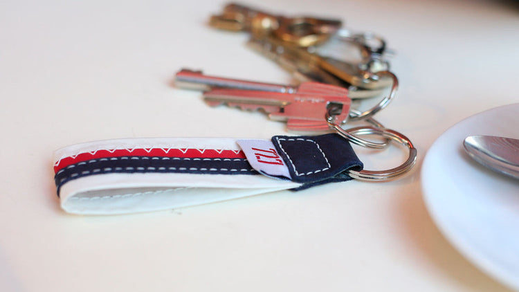 Schlüsselanhänger by 727 Sailbags / Segeltuch weiß rot / Leder navy
