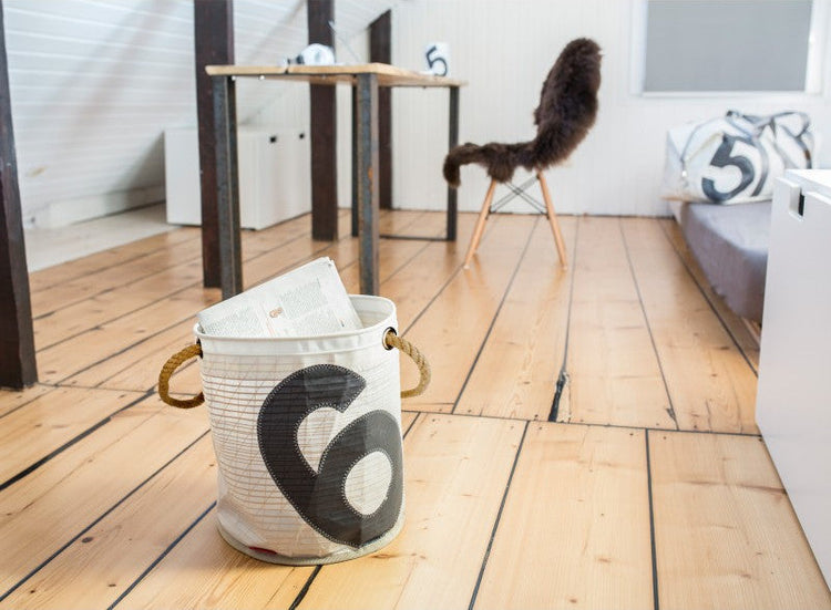 Praktische Wäschekörbe aus recyceltem Segeltuch. Ideal zum Sammeln von getragener Kleidung. Verschiedene Modelle und Marken zur Auswahl.
