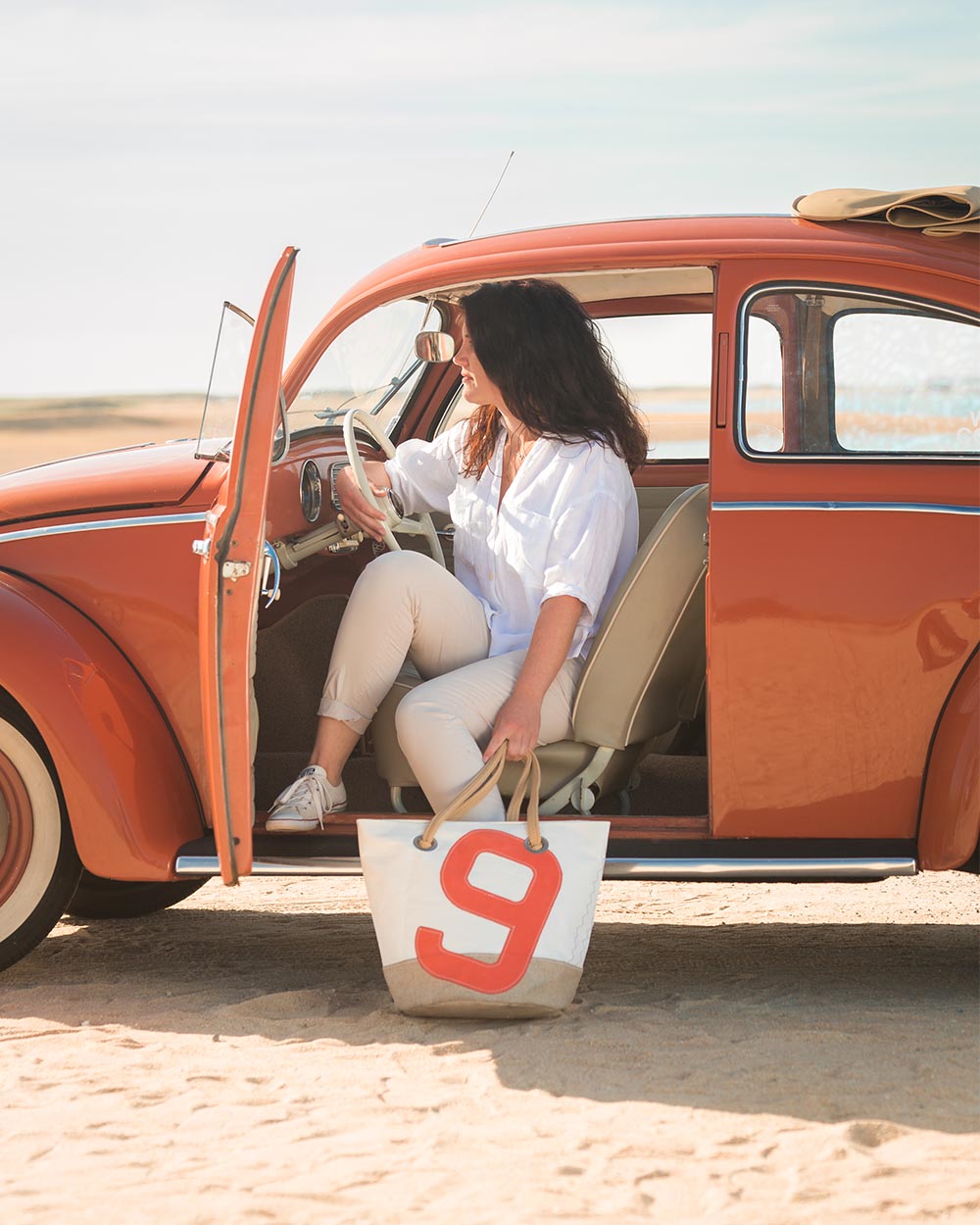 Damen Handtasche "Sandy" by 727 Sailbags / Segeltuch weiß / Boden Leinen / Motiv 9 rot