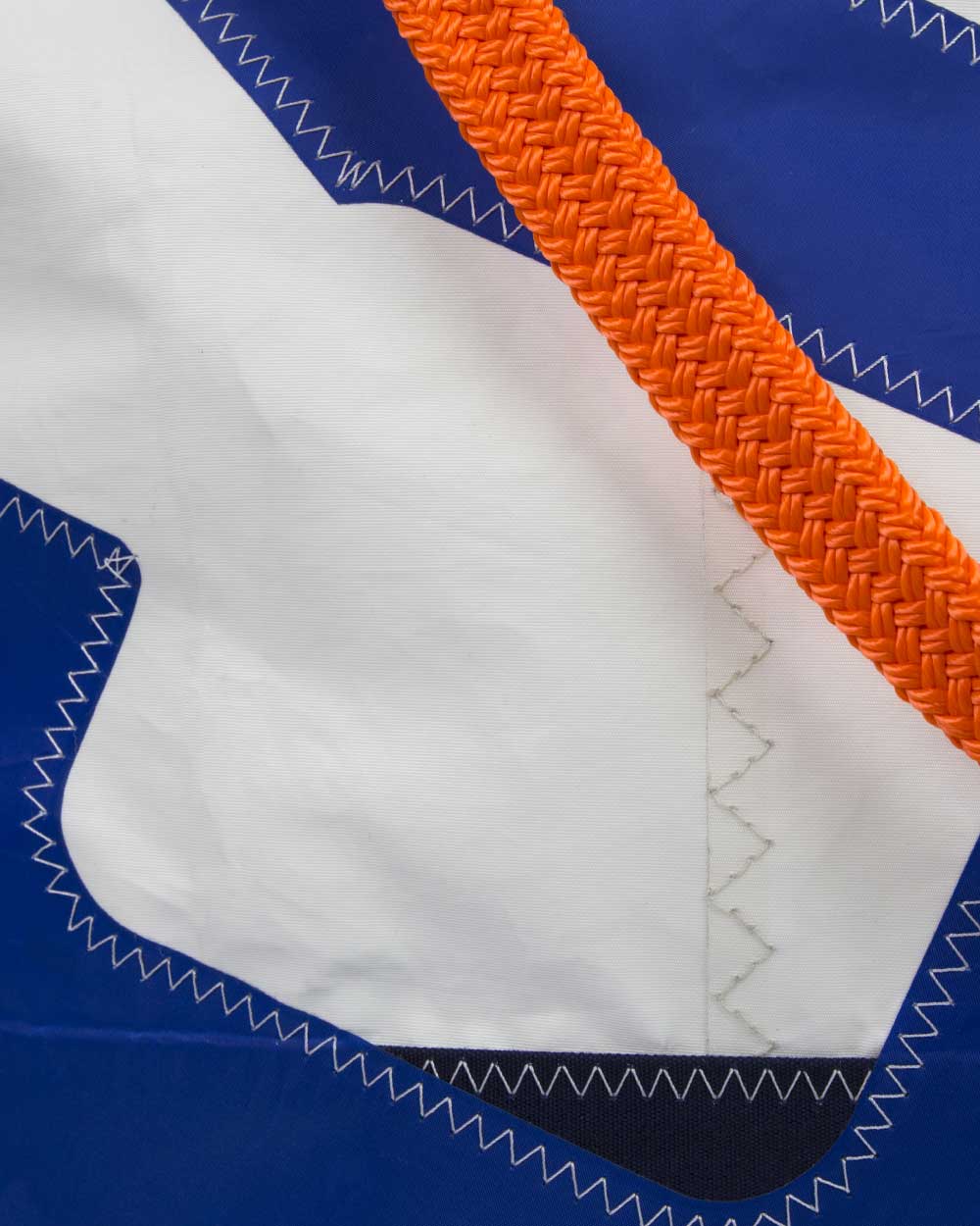 Mit eingenähtem Herkunftsnachweis des Segels.