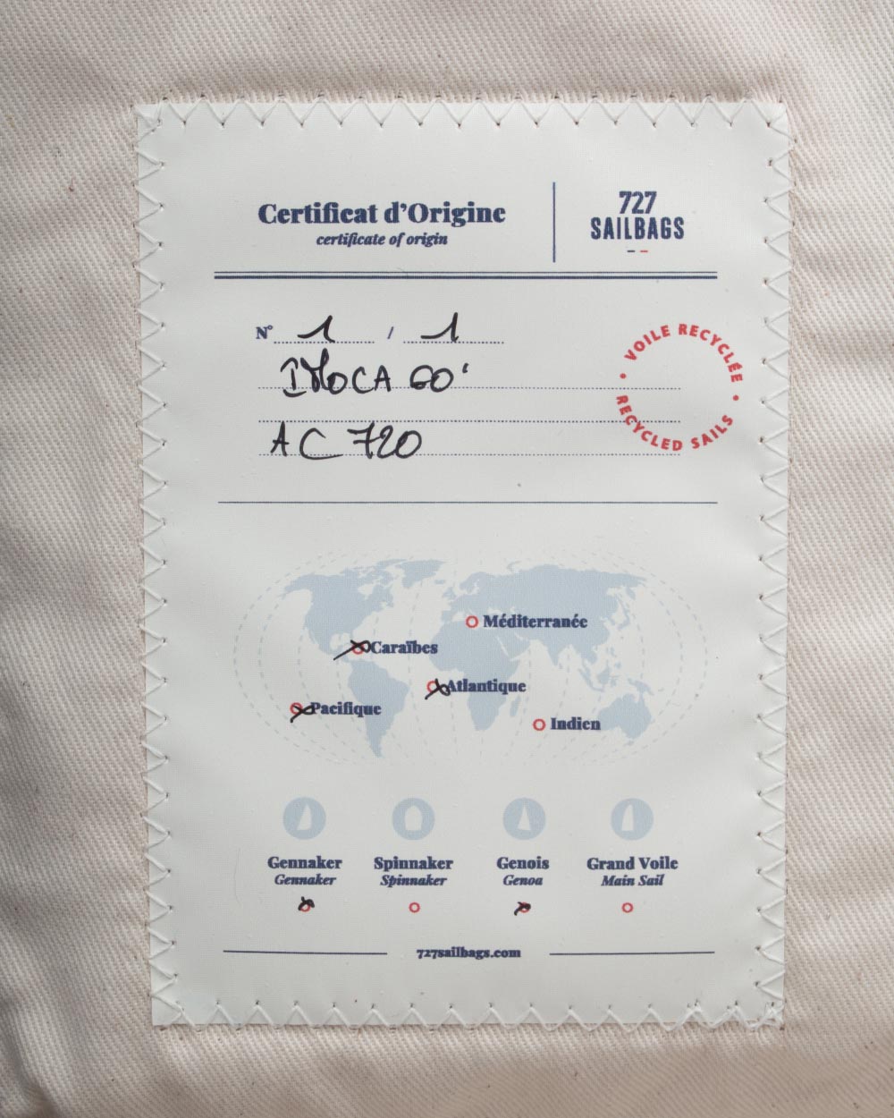 Mit eingenähtem Herkunftsnachweis des Segels.