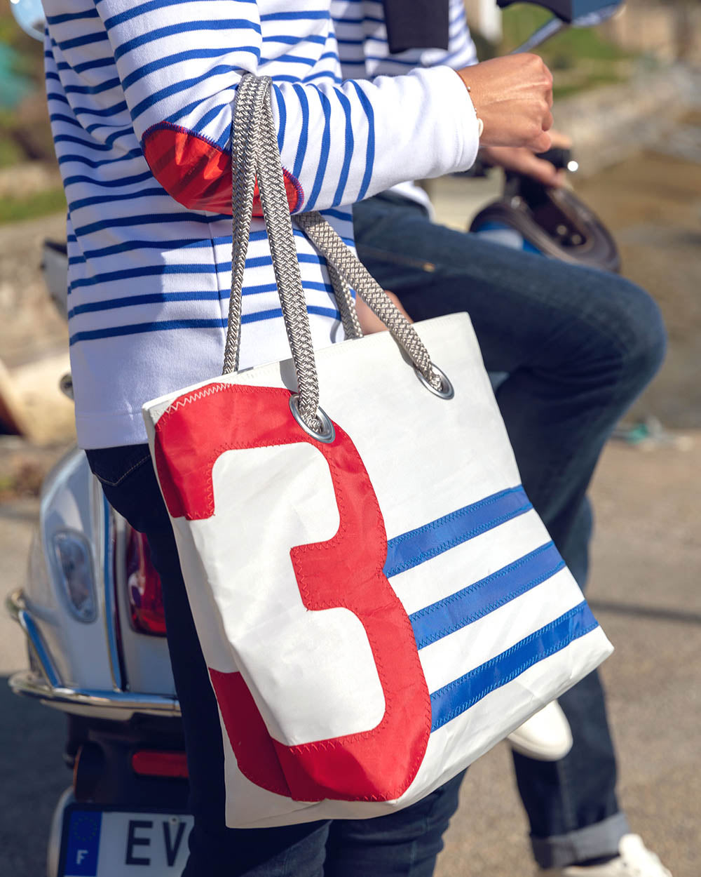 Damen Handtasche "Charlie" by 727 Sailbags / Segeltuch weiß blau / Motiv 3 rot