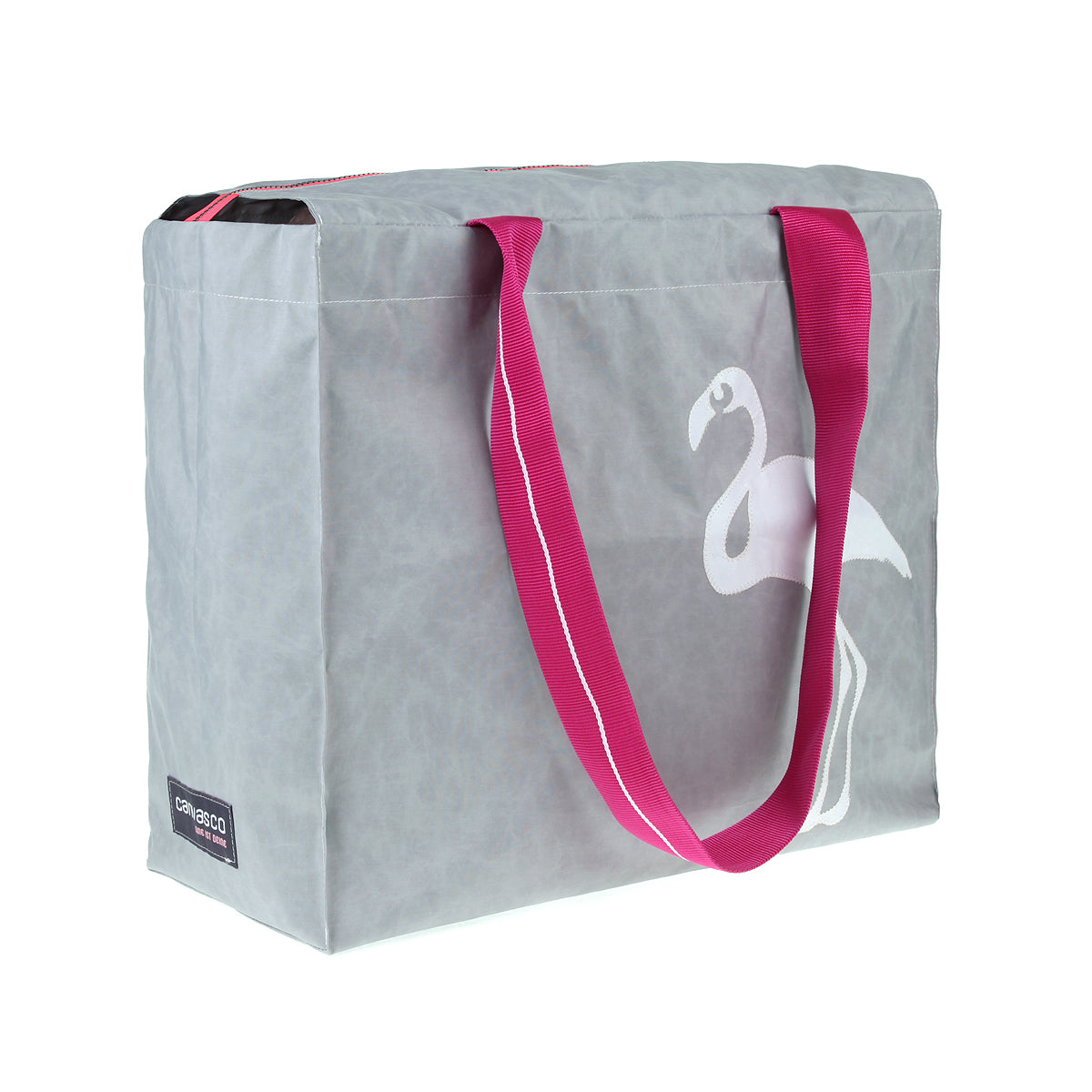 Strandtasche Badetasche CANVASCO "Beach Pro" / Segeltuch grau / Gurt pink-weiß / Motiv Flamingo weiß