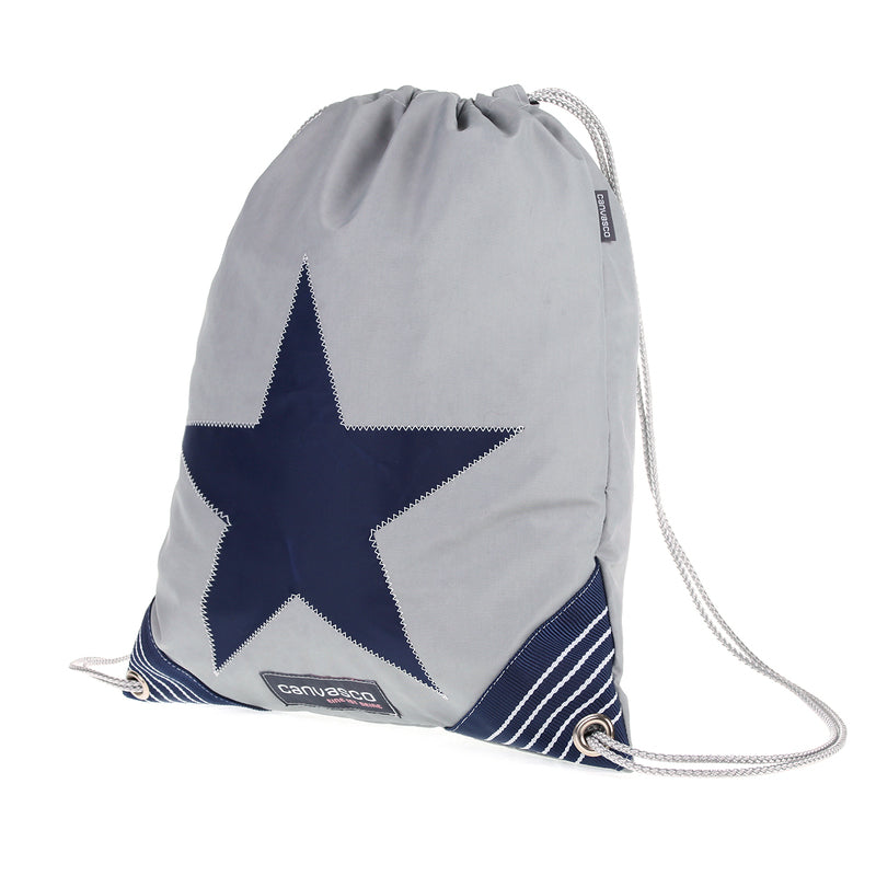 Turnbeutel CANVASCO "Jim" / Segeltuch grau / Ecken blau-weiß / Motiv Stern blau