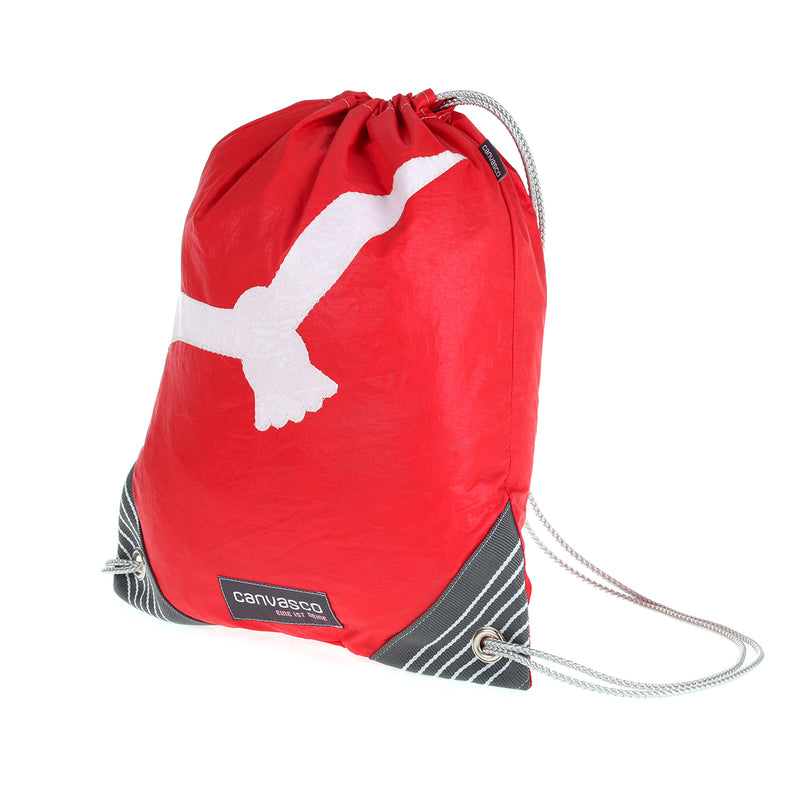 Turnbeutel CANVASCO "Jim" / Segeltuch rot / Ecken grau-weiß / Motiv Möwe weiß