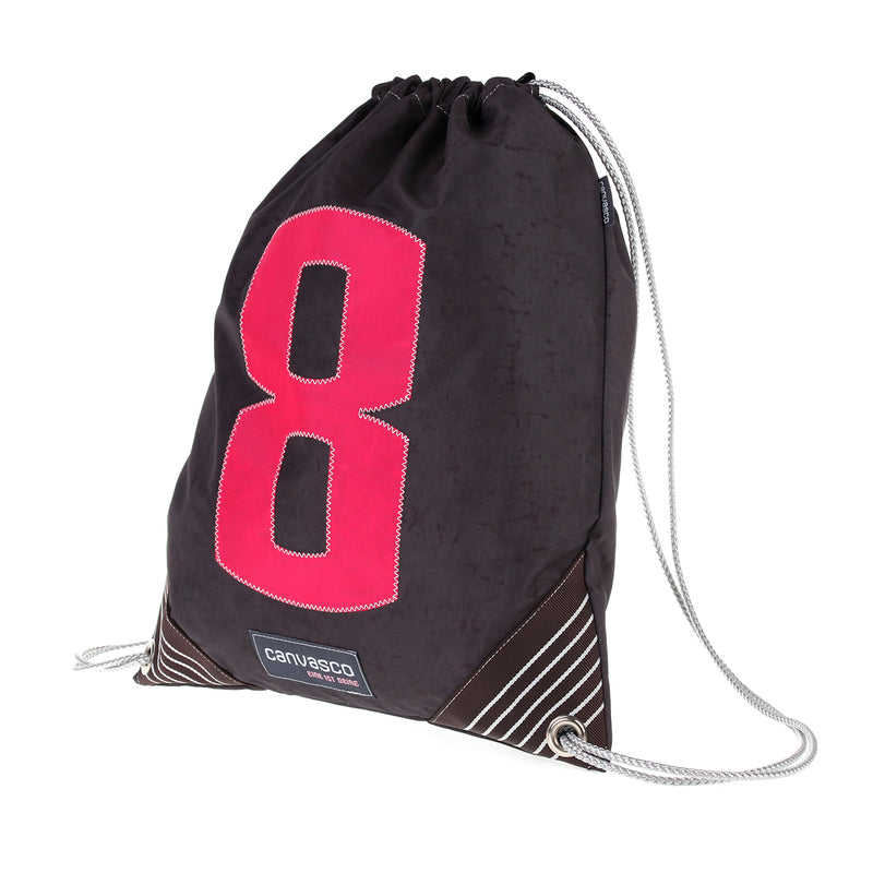 Stylischer UNIKAT Turnbeutel aus braunem Segel, mit braun-weiß gestreiften Ecken und pinker 8 als Motiv. 100% deutsche Handarbeit - recyceltes Segel - wasserabweisend - schön anzusehen - belastbar und robust.