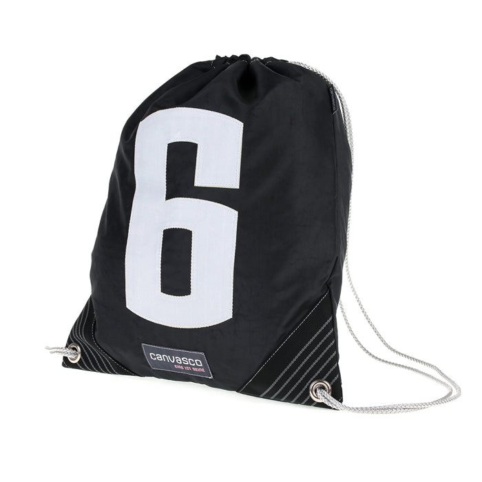 Stylischer UNIKAT Turnbeutel aus schwarzem Segel, mit braun-schwarz gestreiften Ecken und weißer 6 als Motiv. 100% deutsche Handarbeit - recyceltes Segel - wasserabweisend - schön anzusehen - belastbar und robust.