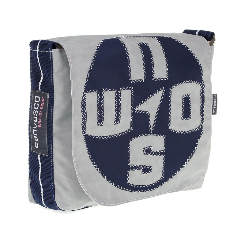 Stylische UNIKAT Messenger Bag aus grauem Segel, mit blau-weiß gestreiftem Gurt und blauem Kompass als Motiv. 100% deutsche Handarbeit - recyceltes Segel - wasserabweisend - schön anzusehen - belastbar und robust.