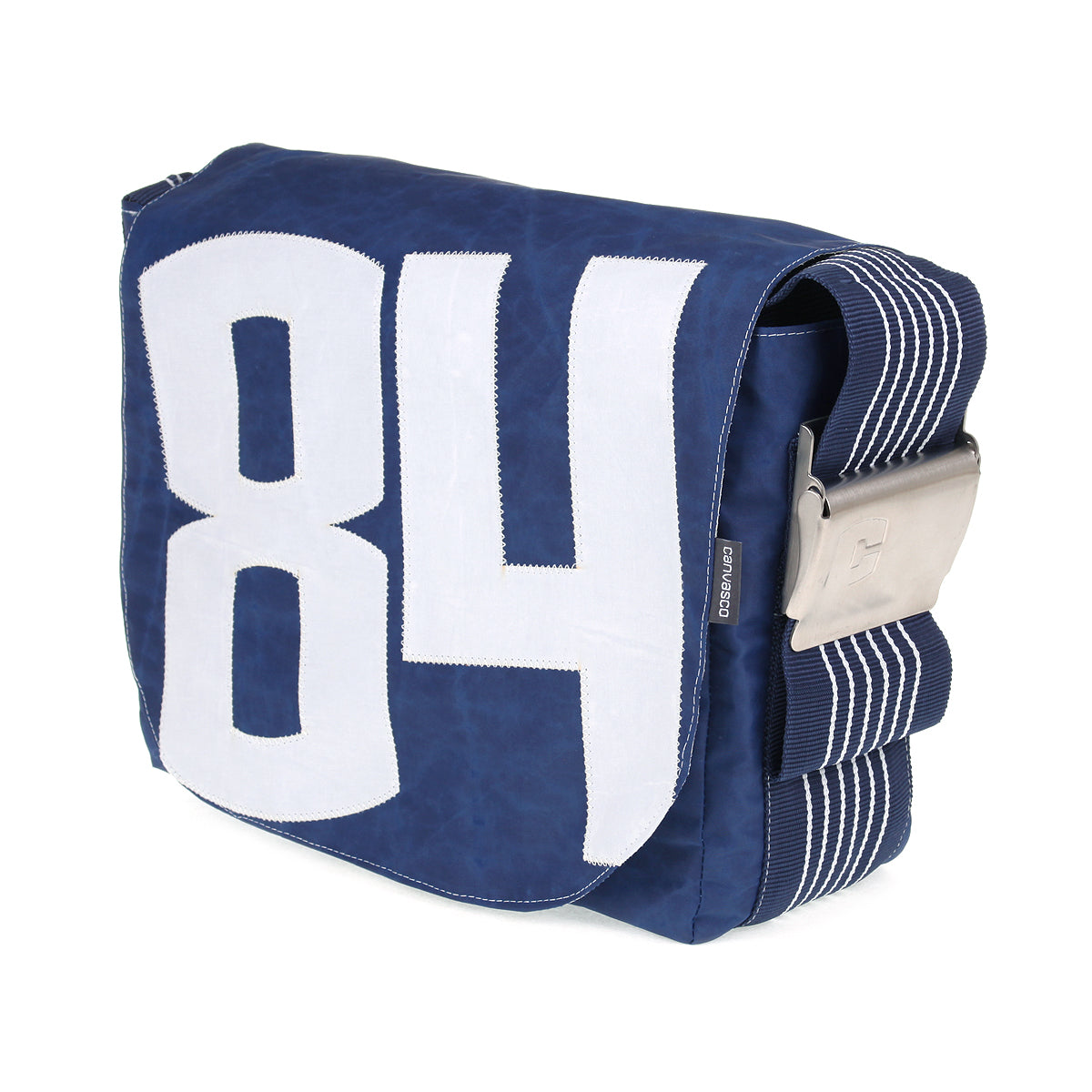 Stylische UNIKAT Segeltuchtasche aus blauem Segel, mit blau-weiß gestreiftem Gurt und weißer 84 als Motiv. 100% deutsche Handarbeit - recyceltes Segel - wasserabweisend - schön anzusehen - belastbar und robust.
