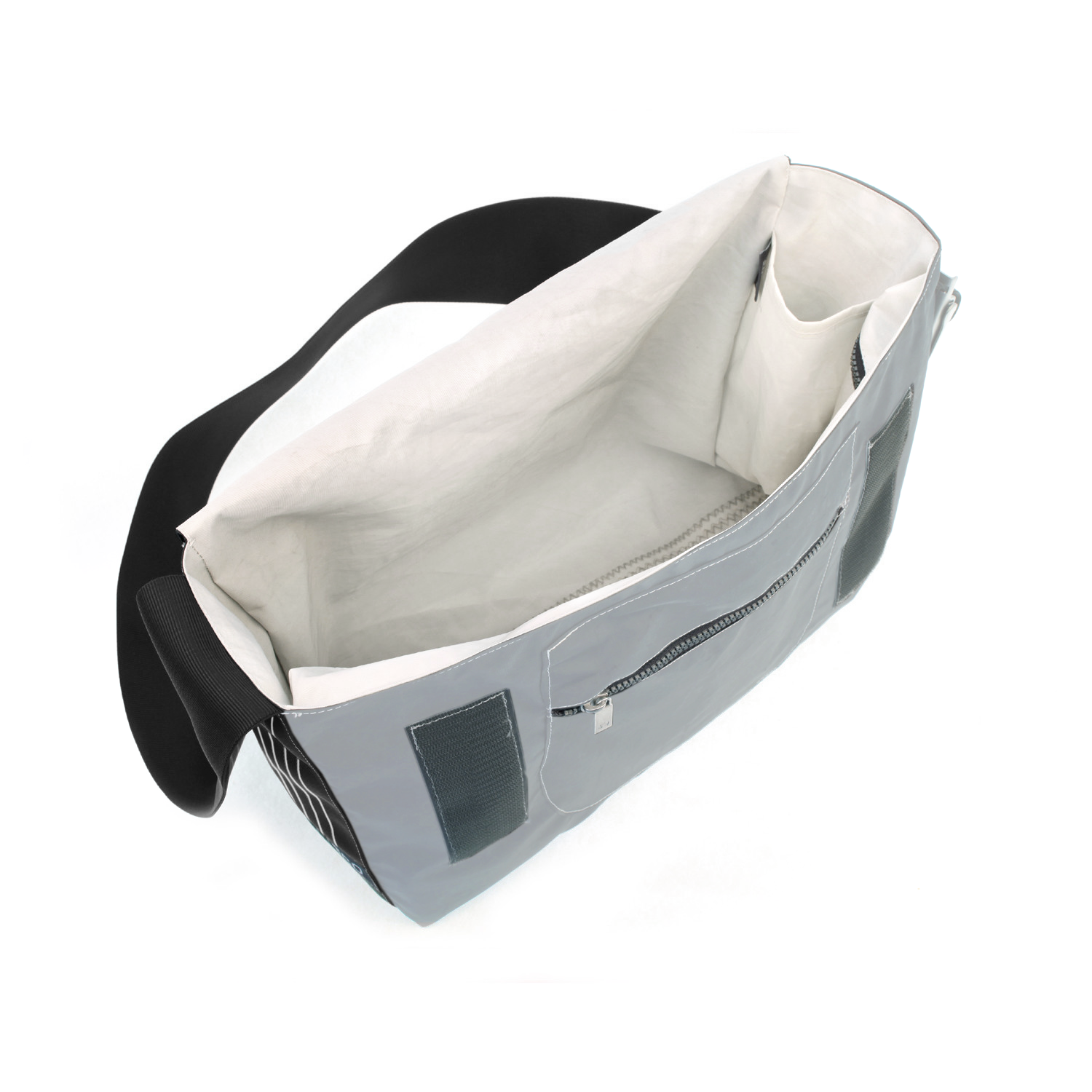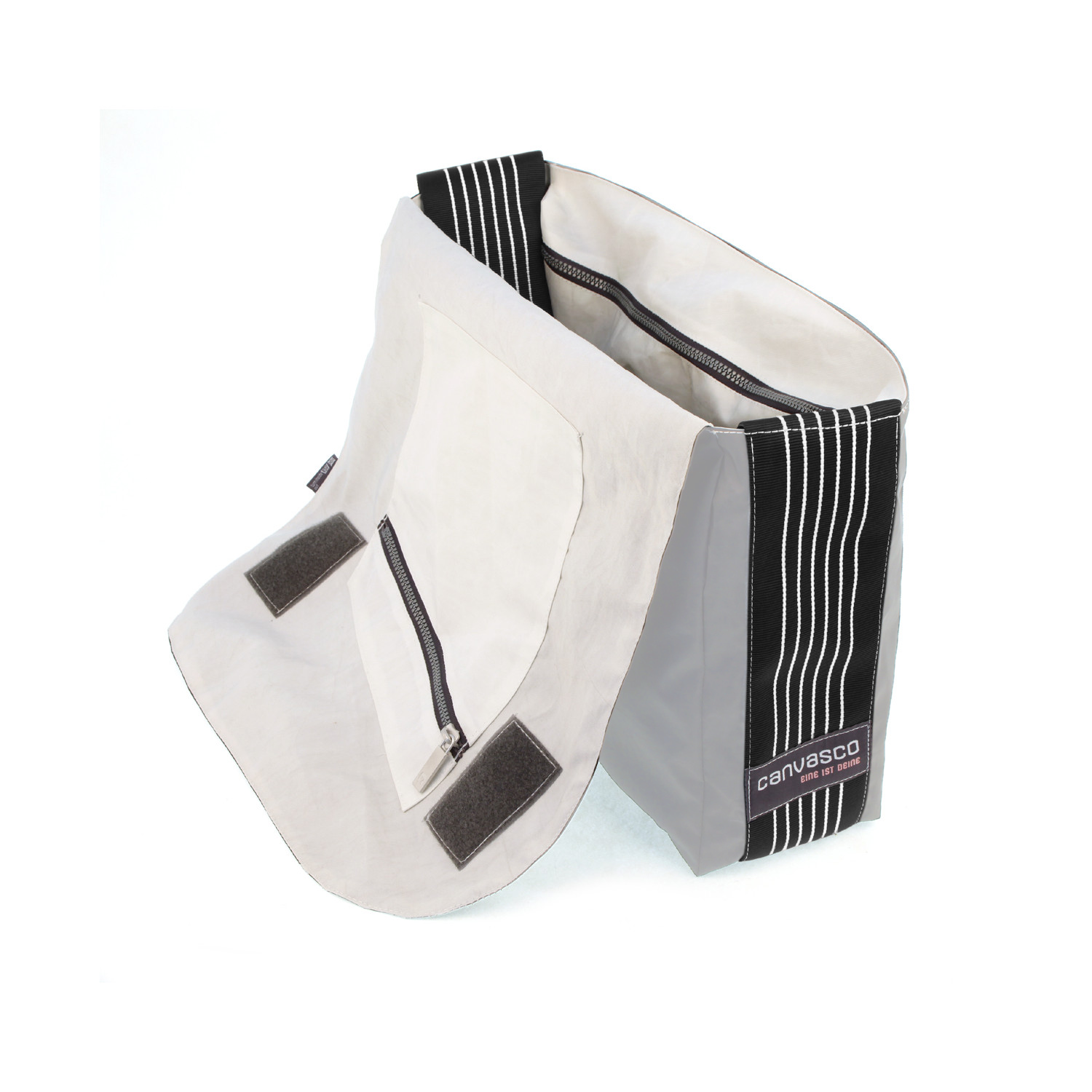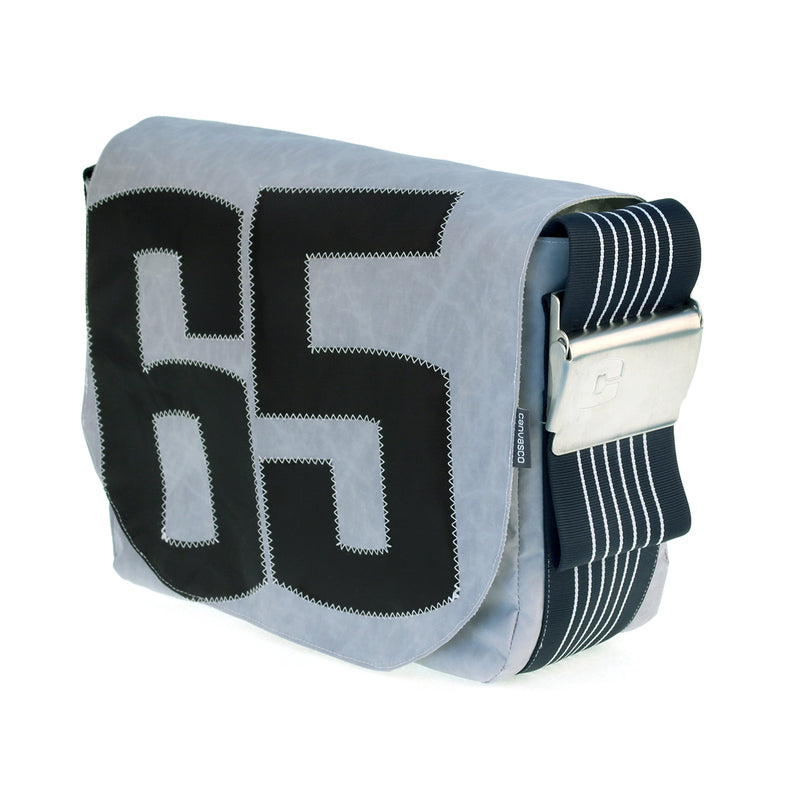 Stylische UNIKAT Segeltuchtasche aus grauem Segel, mit weiß-schwarz gestreiftem Gurt und schwarzer 65 als Motiv. 100% deutsche Handarbeit - recyceltes Segel - wasserabweisend - schön anzusehen - belastbar und robust.