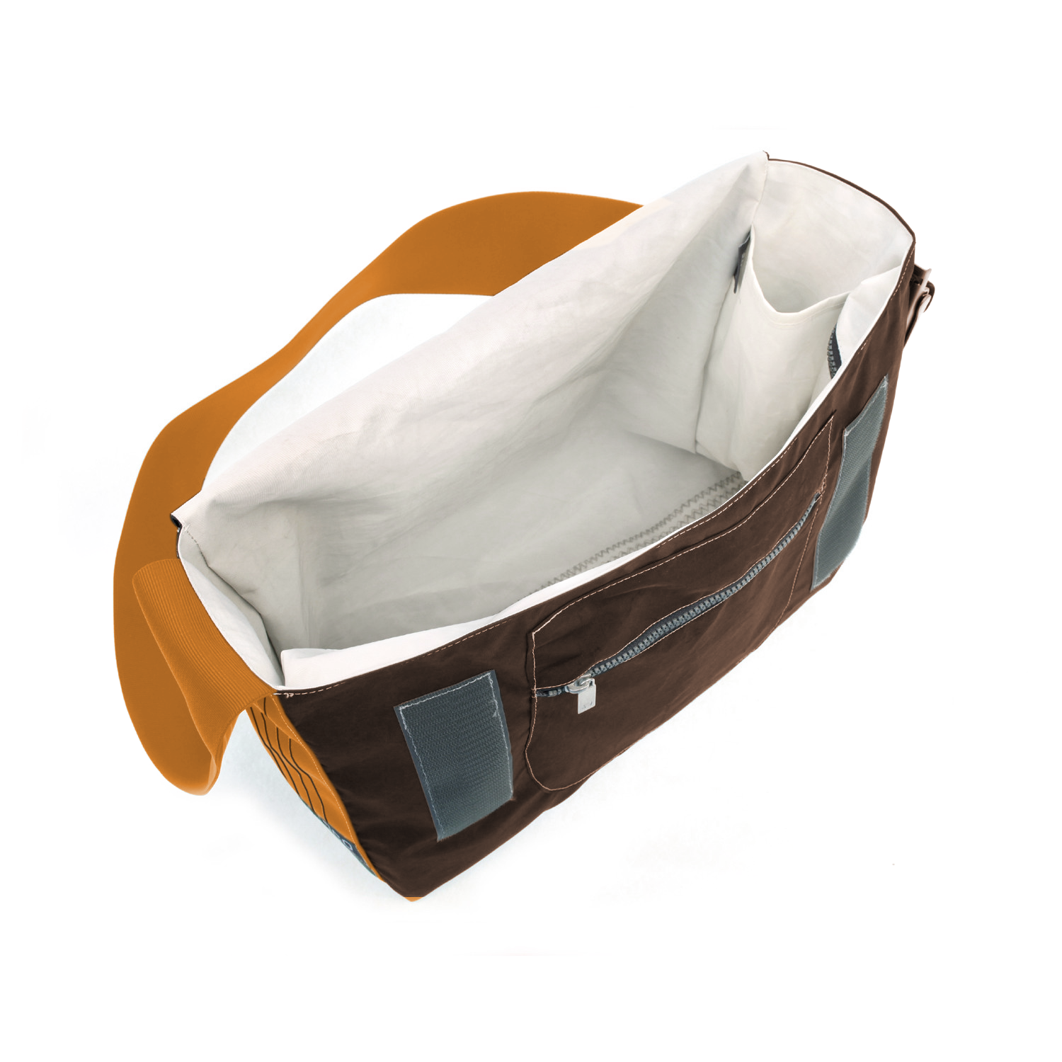 Stylische UNIKAT Segeltuchtasche aus braunem Segel, mit cognac-schwarz gestreiftem Gurt und weißer 85 als Motiv. 100% deutsche Handarbeit - recyceltes Segel - wasserabweisend - schön anzusehen - belastbar und robust.