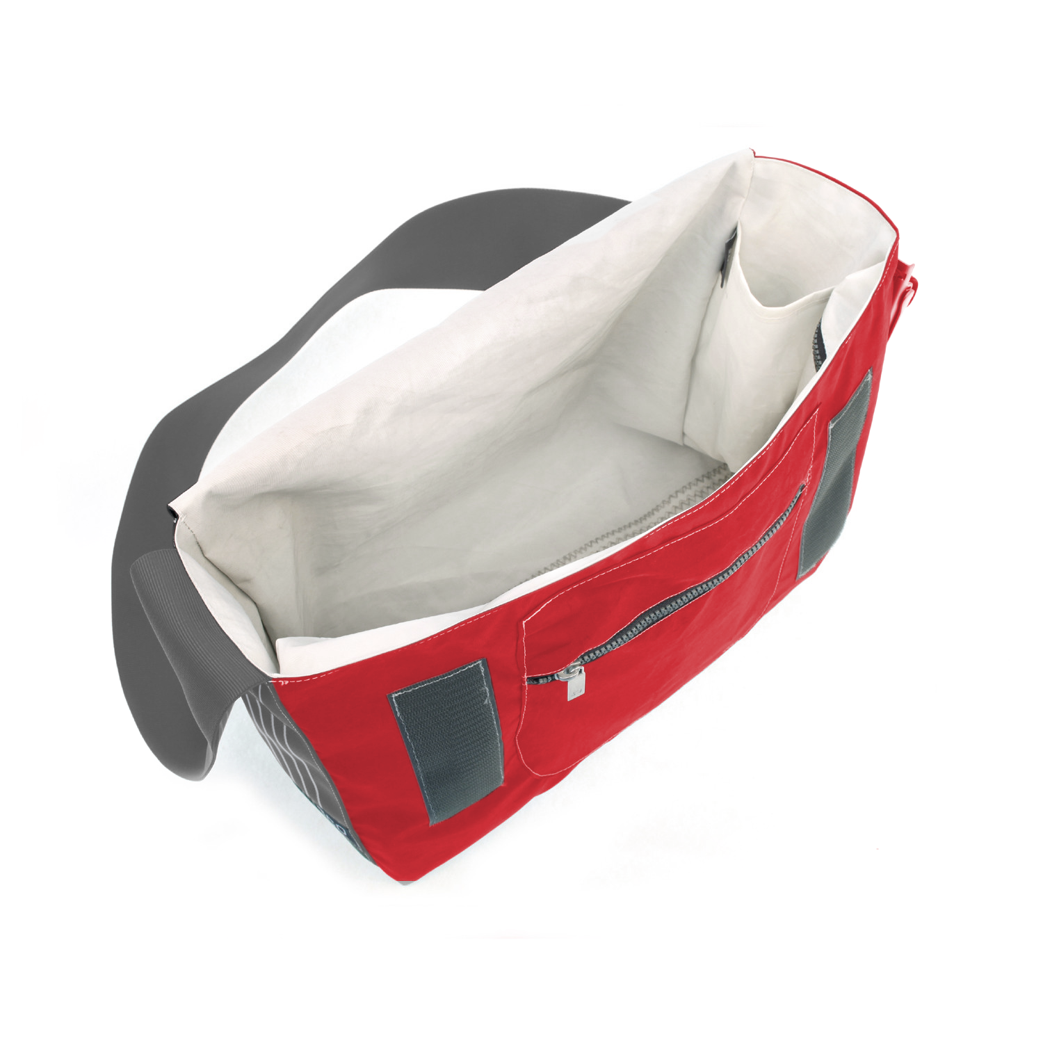 Stylische UNIKAT Segeltuchtasche aus rotem Segel, mit grau-weiß gestreiftem Gurt und weißem Kreuz als Motiv. 100% deutsche Handarbeit - recyceltes Segel - wasserabweisend - schön anzusehen - belastbar und robust.